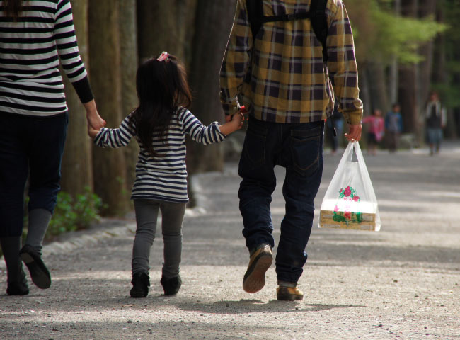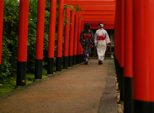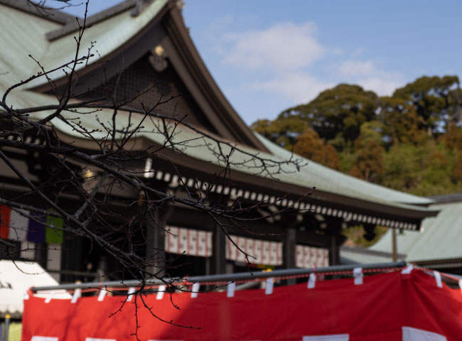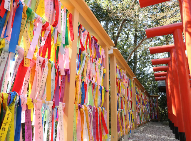 女性を見守るお社で、願い事の成就を祈願し、帯を結びます。